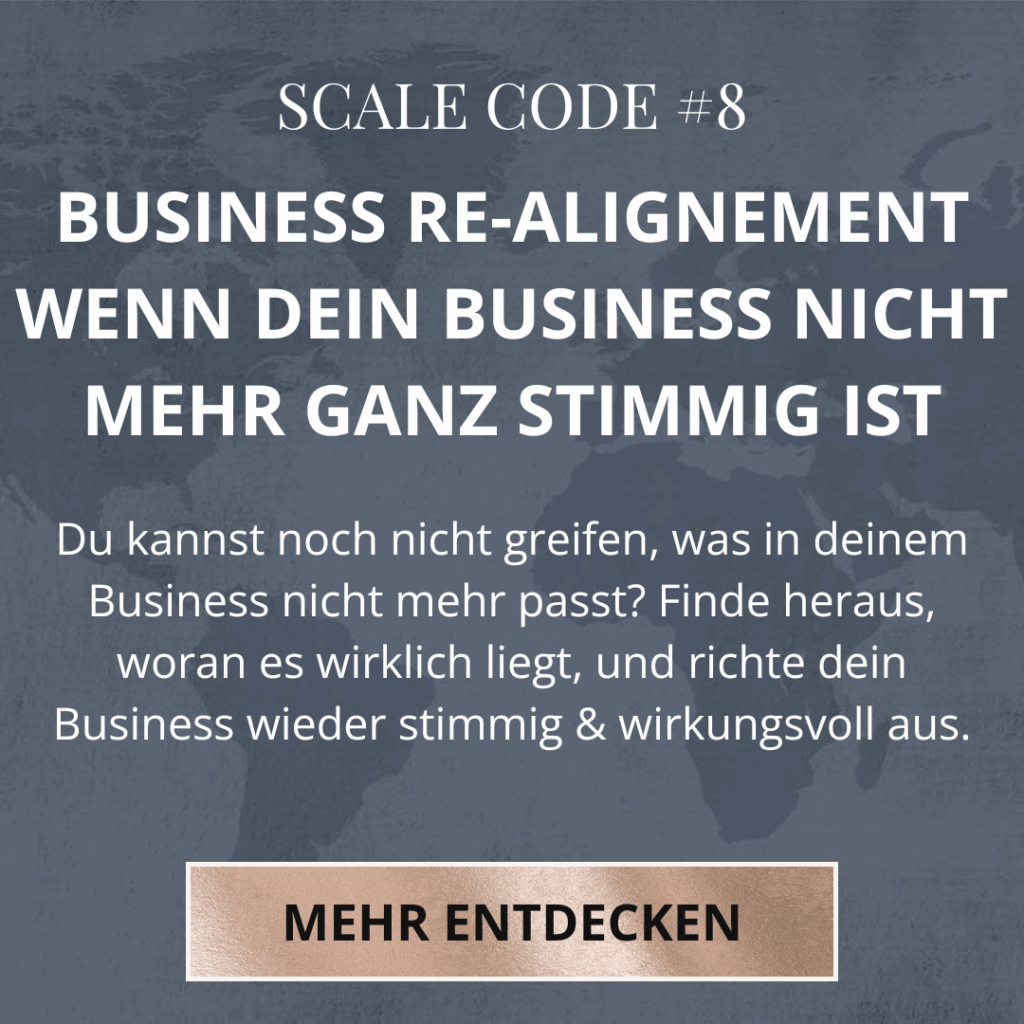 Diese Matrix ist ein erster, wichtiger Schritt im Scale Code 8: Business Re-Alignment & Neukonzeption. Für ein Business, das wieder 100 % zu dir passt. In deiner Energie, in deiner Zone of Genius, mit klarer Struktur und Leichtigkeit. Für mehr Spaß, mehr Stimmigkeit und mehr Wirkung, ohne alles umschmeißen zu müssen. Wir schauen dabei nicht nur auf deine Angebote, sondern auch auf alle anderen Bereiche deines Business. So weißt du genau, wo du Re-Alignment oder vielleicht auch eine Neukonzeption brauchst und richtest deinen Fokus und deine Energie genau auf die Dinge, die für dich die größte Hebelwirkung haben.
