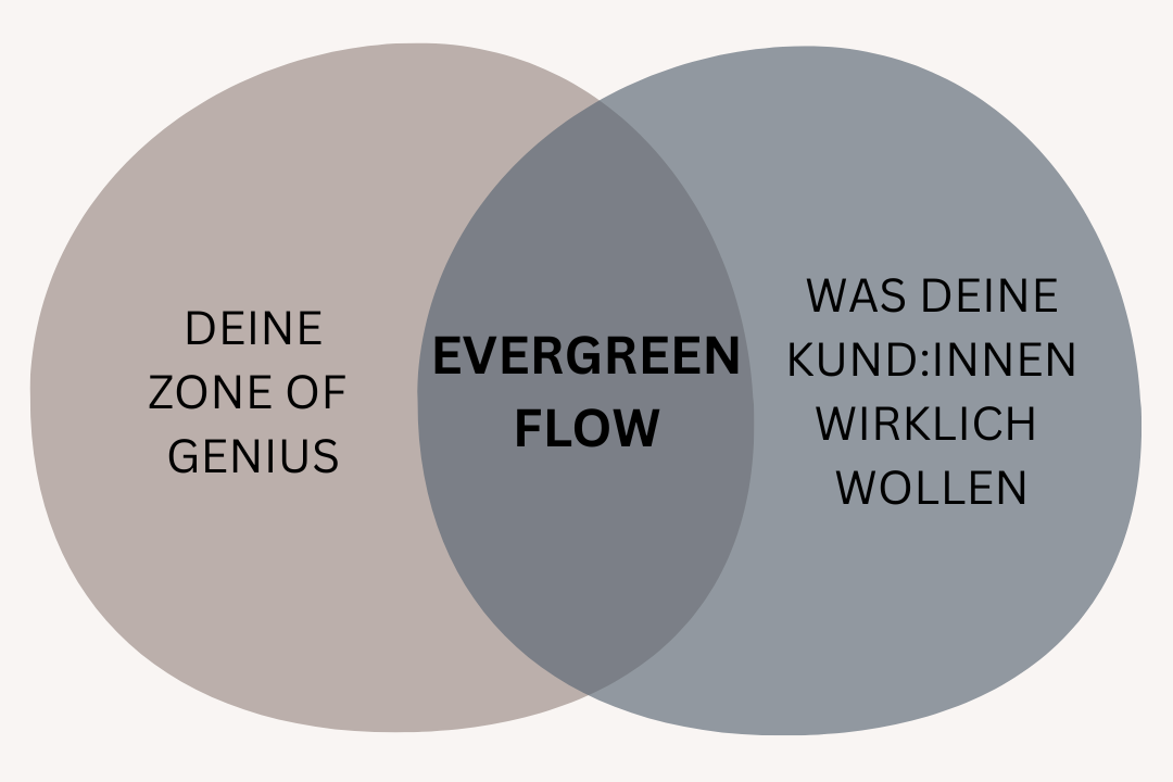 Evergreen Flow ist kein One-Size-Fits-All. Du justierst du dein Angebot neu, damit es dich (wieder) begeistert, und es sich endlich fast wie von selbst verkauft. Weil es genau die Schnittmenge trifft zwischen deiner Zone of Genius und dem, was deine KundInnen jetzt wirklich kaufen wollen. Egal, ob du lieber individuell mit Kunden arbeitest oder skalierbare Gruppenformate nutzt.