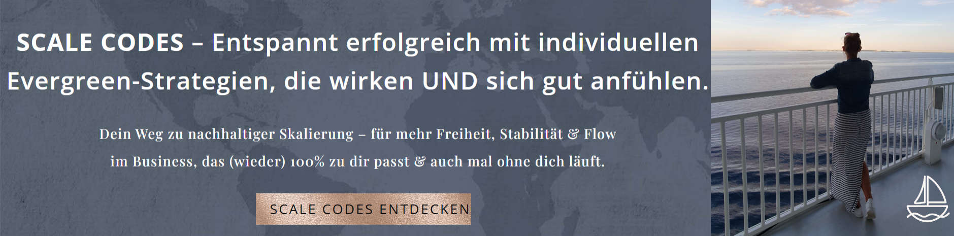 Die SCALE CODES sind kein Online-Kurs und keine 5-Schritte-Methode. Sondern ein Format, das endlich Klarheit schafft – und dich wieder in die Umsetzung bringt, wenn deine bisherigen Strategien nicht (mehr) optimal für dich funktionieren.